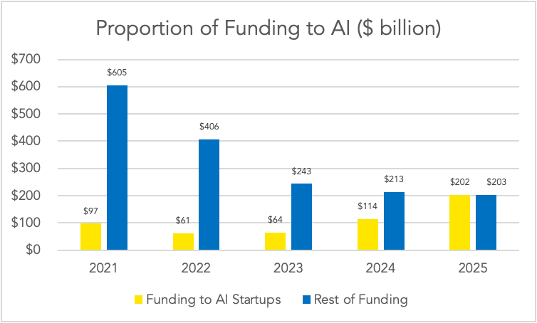 At the same time, we have become wary of over-inflated expectations, especially in private markets. According to data analyzed by Crunchbase, AI startups captured 50% of all venture capital investing in 2025, up 37% from a year prior. Another recent Financial Times analysis found that 10 unprofitable AI startups saw their combined market value hit $1 trillion in 2025.