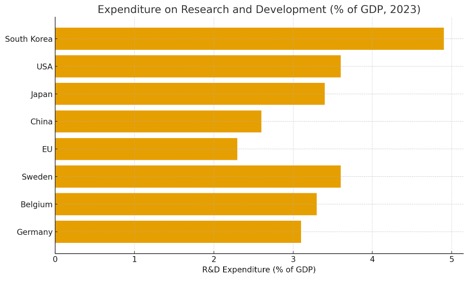 In Lisbon, Portugal’s former finance minister Paulo Portas presented a slide that captured Europe’s innovation dilemma in a single image. The data told the story: while South Korea invests 4.9% of its GDP in research and development, and the United States 3.6%, the European Union averages just 2.3%—a gap that has widened over the past decade.